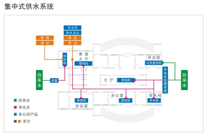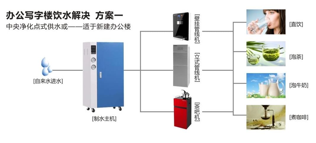 方案1 集中式凈水方式——適用于整棟或多層寫字樓; 這種方式便于統籌安裝管理,成本總體比較低,采用中央凈水,分散供水的方式。